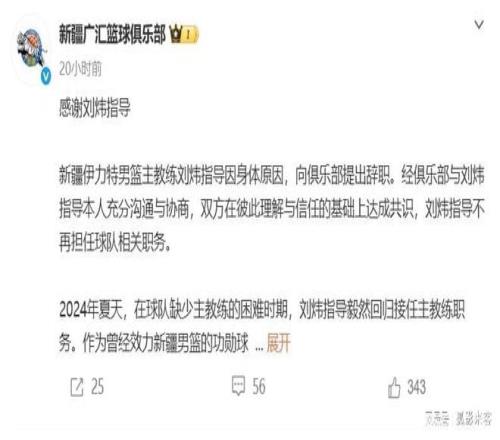 昨天新疆队正式官宣刘炜指导离队,并且感谢刘炜指导这两年在新疆队的复出,祝愿他未来的生活和工作一切顺利。其实刘炜指导早在一个月前就已经卸任了新疆队主教练的职务,只是他还在新疆队担任其他的职务,并没有离开新疆队的教练组,这次官宣应该是刘炜指导和新疆队正式告别,春节后他可能会加入其他的球队重新开始。
