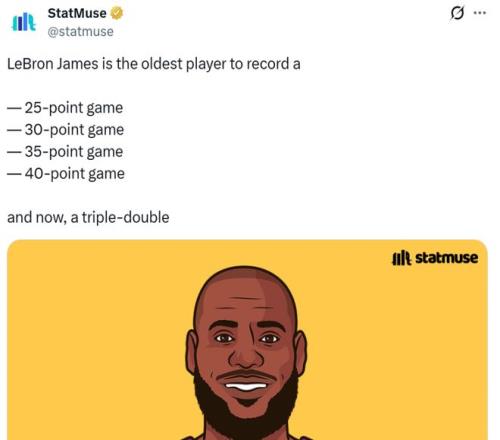 纪录二:本场比赛是詹姆斯本赛季首次拿到三双,这让41岁45天的詹姆斯超越03年40岁127天马龙创造的NBA历史纪录,成为NBA历史上拿下三双最老的球员。