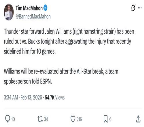 不仅核心亚历山大持续缺阵,二当家杰伦威廉姆斯又遭遇右腿筋拉伤,此前他因为这一伤病连续缺席10场,突然复出对阵湖人后再度受伤,这样的状况不仅有可能影响雷霆队常规赛阶段竞争联盟第一宝座,更是给季后赛卫冕之旅埋下不小的隐患。