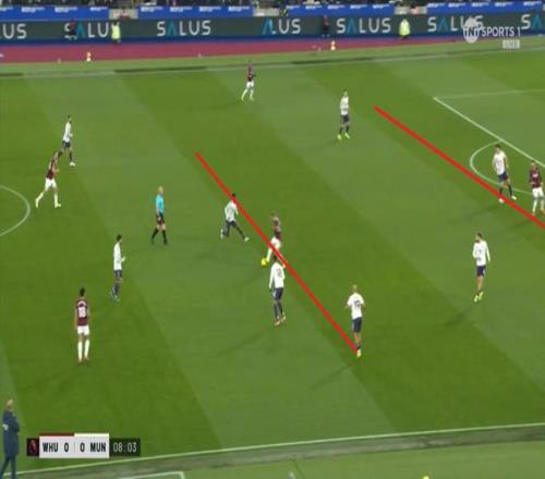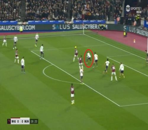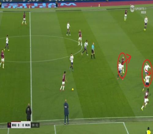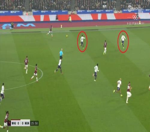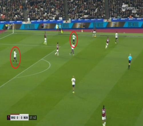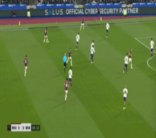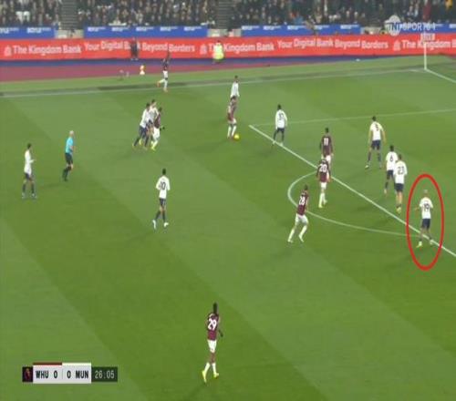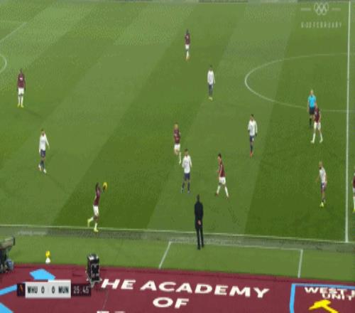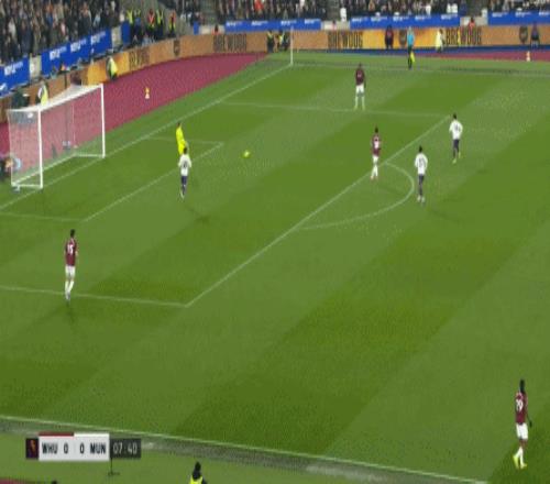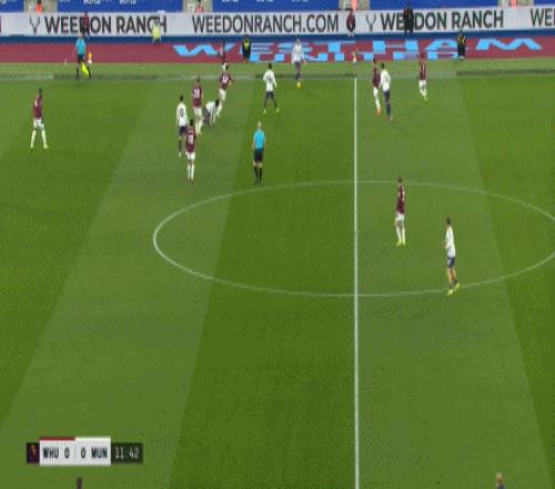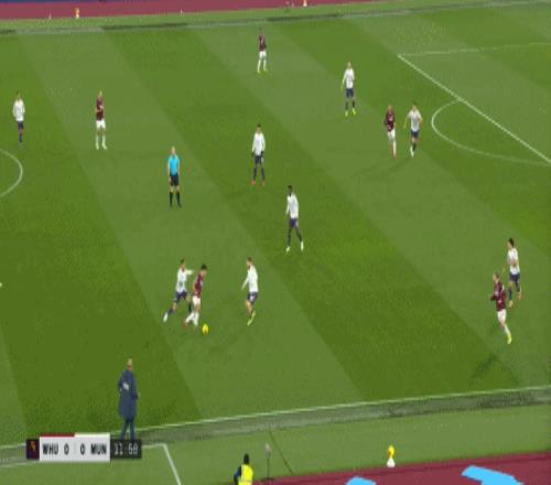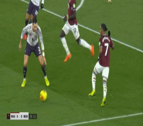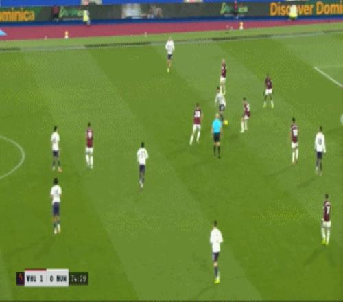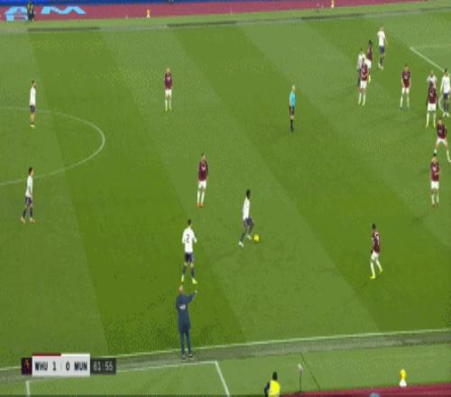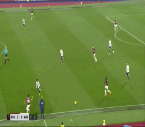 等到下半场回来,西汉姆联打出了上半场从未用过的进攻套路,那就是右路,因此遭殃的不是达洛特、卡塞米罗和马奎尔,问题来到了梅努的身上:
