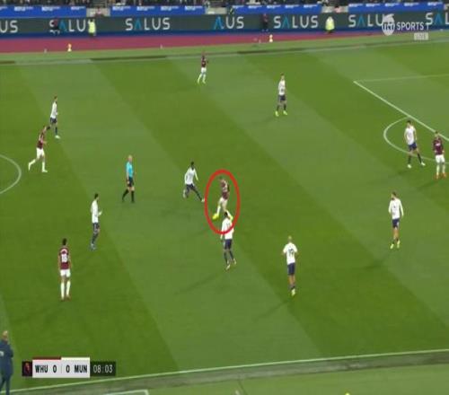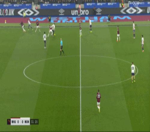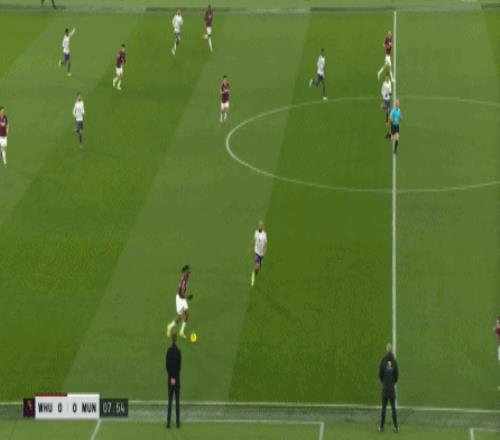 但是,西汉姆联虽然打穿了曼联的逼抢线,并且完成了横向转移,但并未因此打出速度和推进,球权来到右侧,面临在中线高度建立进攻的局面。