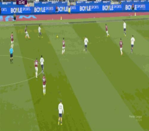 然后,鲍文摆脱了梅努,再次完成了一次横向转移,西汉姆联又把球打到了左侧:
